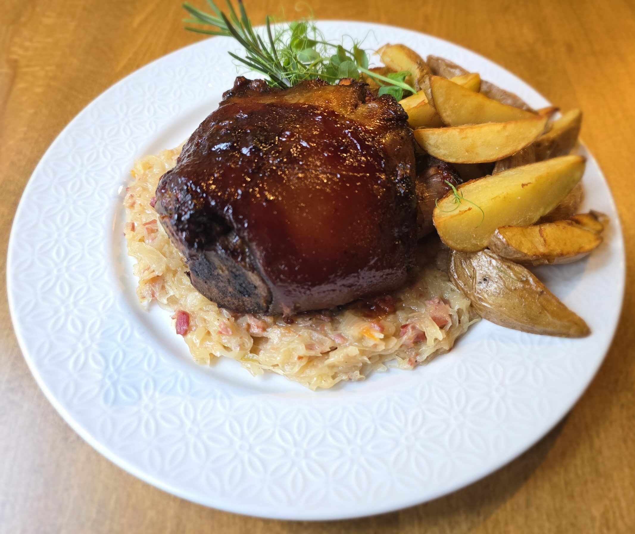 kapusta zasmażana, ziemniaki opiekane, chrzan, musztarda