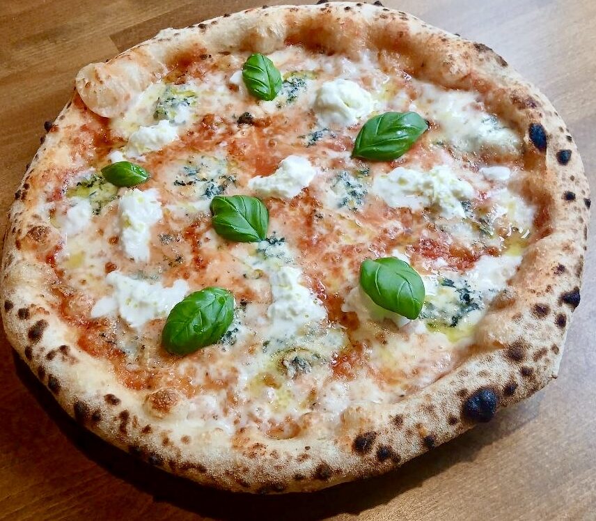 sos pomidorowy San Marzano, mozzarella fior di latte, parmezan, gorgonzola, mozzarella di buffala, oliwa rozmarynowa