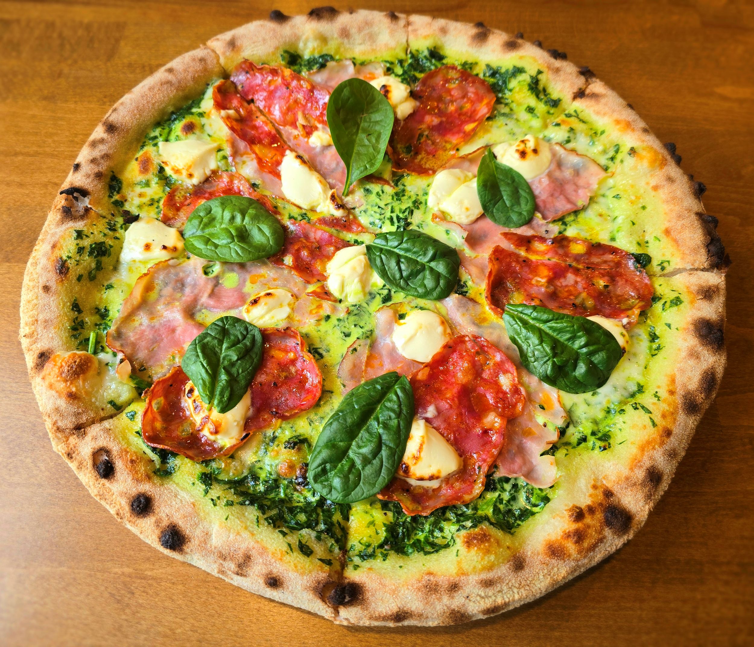 sos śmietanowo – szpinakowy, mozzarella fior di latte, salami piccante, mascarpone